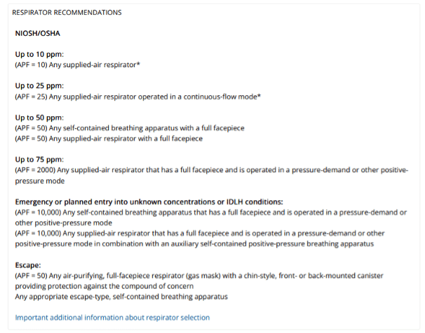 In the US, the National Institute for Occupational Safety and Health (NIOSH) and Occupational Safety and Health Administration (OSHA) have set the following exposure limits in parts per million (ppm):