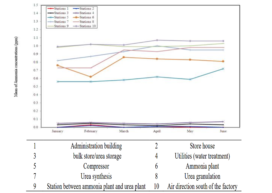Figure 2. “Ammonia concentrations (ppm) during six months in different stations in modern modified nitrogenous fertilizer factory,” Elhadad et al. 2025. (Credits: 10.21608/asejaiqjsae.2025.438195)