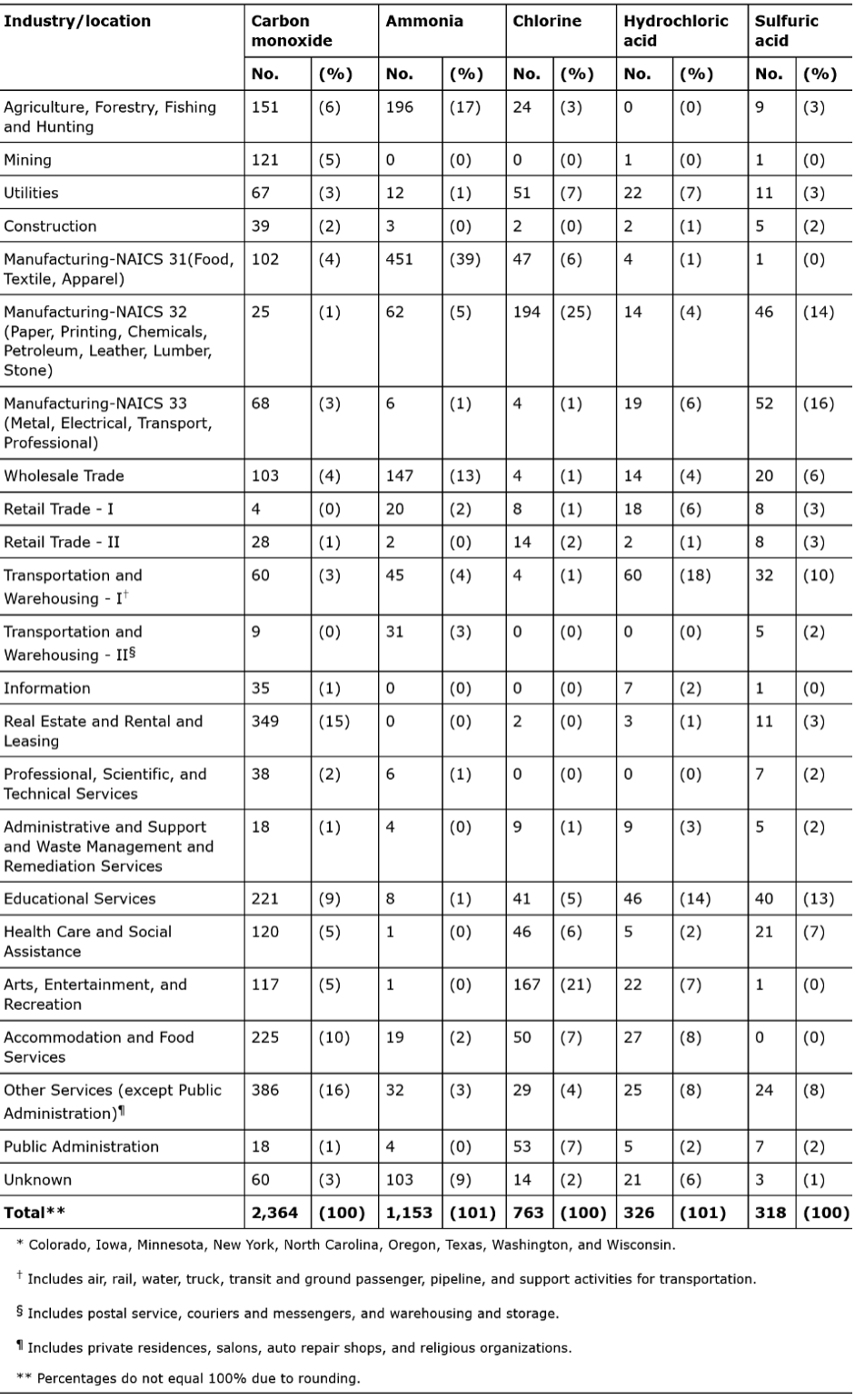 Several industry-specific gases are emitted. However, some common gases occur in many industries. According to a 2015 CDC report, of the 57,975 chemical release incidents reported to the Hazardous Substances Emergency Events Surveillance (HSEES) system between 1999 and 2008, 95% occurred due to exposure to a specific chemical. Among them were three gases. The five chemicals were responsible for 37% (4924 cases) of injuries, even though they accounted for only 3% (1383 cases) of release incidents. These five caused a quarter of all deaths attributed to chemicals. These five chemicals were the gases carbon monoxide, ammonia, and chlorine, as well as hydrochloric acid and sulfuric acid.