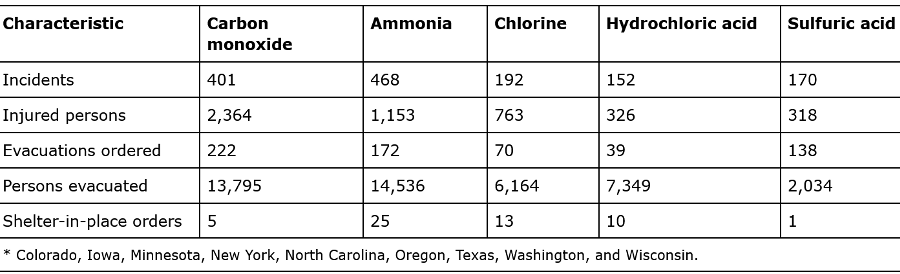 Table 2: “Number of incidents, persons injured, evacuations, and shelter-in-place orders, by top five chemicals released — Hazardous Substances Emergency Events Surveillance system, nine states, * 1999–2008,” Anderson (2015). (Credits: https://www.cdc.gov/mmwr/preview/mmwrhtml/ss6402a6.htm#Tab1)