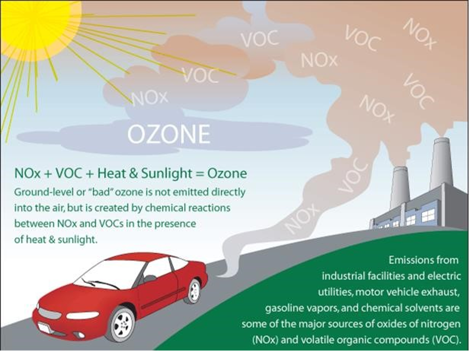 While stratospheric ozone is beneficial, (tropospheric or) ground-level ozone is harmful because it has adverse health effects on people. Ozone is not released directly into the air, but is created during reactions among SO2, NO2, CO, and VOCs in the presence of sunlight and heat, as shown in Figure 2. These primary pollutants are released by vehicles, power plants, and industries that use boilers, refineries, and chemical facilities. Ozone (O3) is formed year-round and can reach unhealthy levels, especially on sunny, warm days in urban centers. From cities, ozone is transported long distances to reach rural areas and natural ecosystems. Ozone health and environmental effects are as follows: