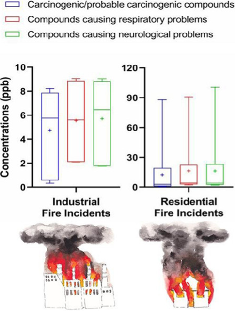 Figure 1. A study comparing various fire accidents found that gases leading to cardiovascular and neurological diseases and cancers were higher in industrial fires Alharbi et al., (2021). (Image credits: DOI 10.1016/j.scitotenv.2021.145332)