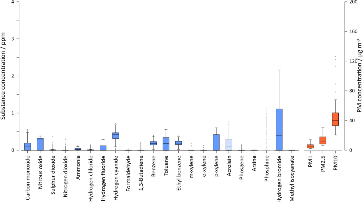 Figure 2: “Substances measured during a fire at a chemical plant manufacturing pesticides.‘Ghosted’ boxes indicate substances where significant cross-interference from other substances is likely, and so should be considered as less reliable,” Griffiths et al. (2018). (Image credits: https://doi.org/10.1016/j.envint.2022.107152)