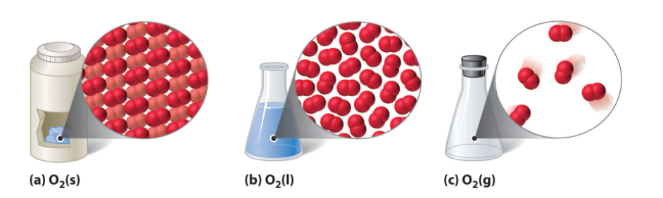 Figure 1: “A Representation of the Solid, Liquid, and Gas States. (a) Solid O2 has a fixed volume and shape, and the molecules are packed tightly together. (b) Liquid O2 conforms to the shape of its container but has a fixed volume; it contains relatively densely packed molecules. (c) Gaseous O2 fills its container completely—regardless of the container’s size or shape—and consists of widely separated molecules,” LibreTexts Chemistry
